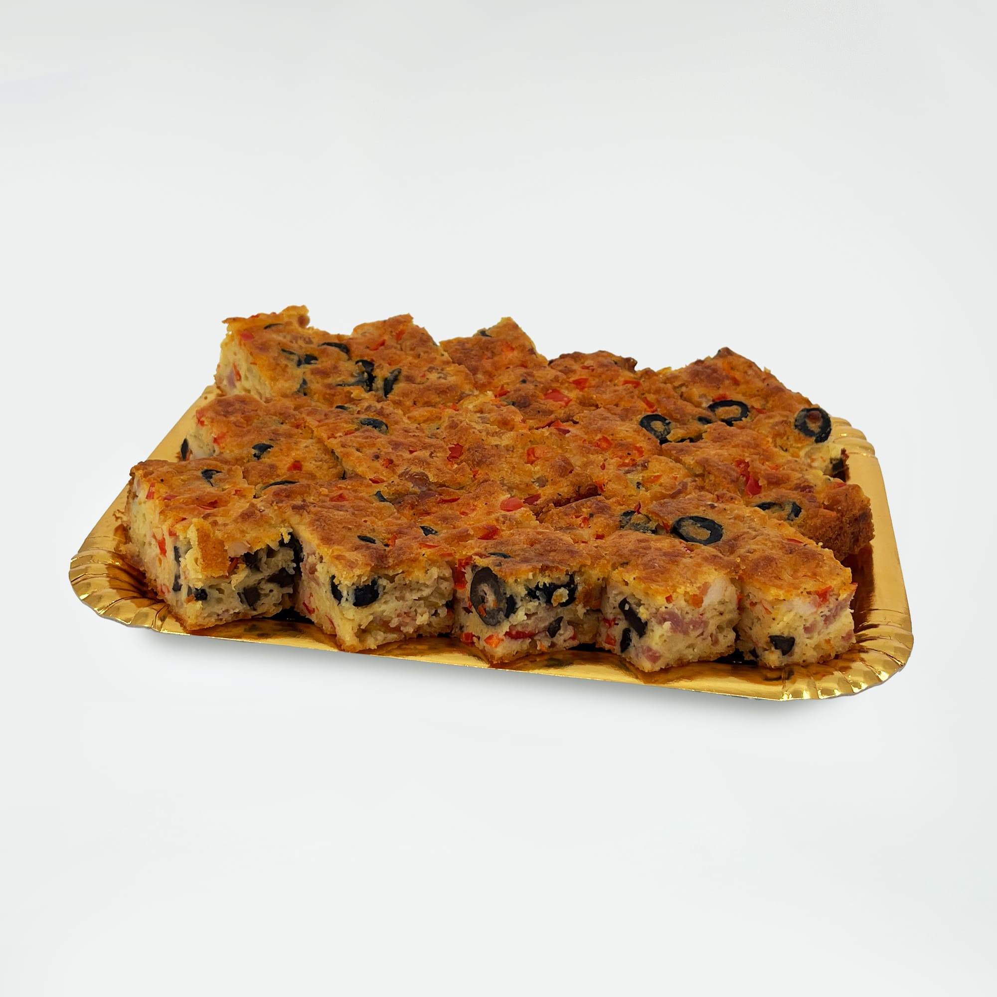 Preparat sărat, cu blat pufos, îmbogățit cu cașcaval ras, bacon afumat, ardei capia și măsline, perfect pentru gustări rapide sau aperitive la mese festive.