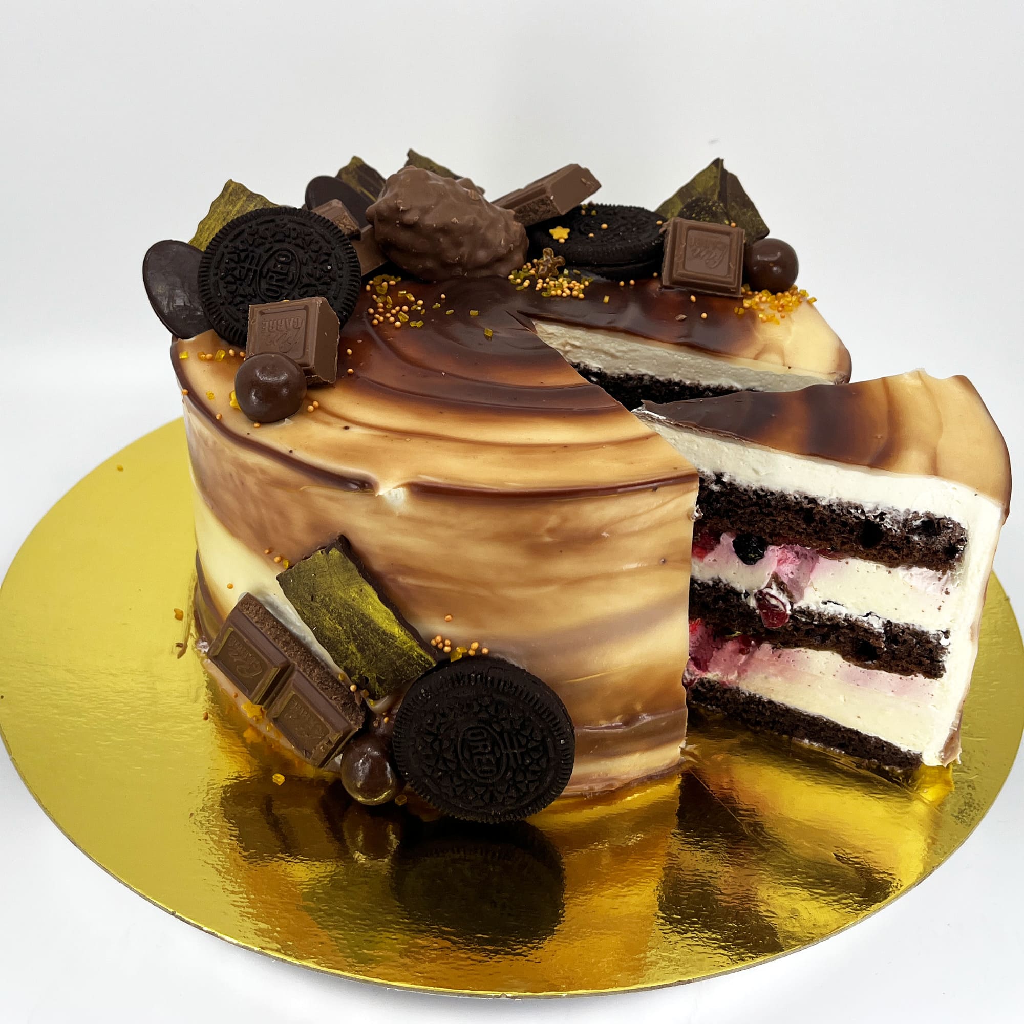 Desert rafinat, ce îmbină blatul de cacao însiropat cu prospețimea fructelor de pădure și crema de brânză, oferind o experiență de neuitat.