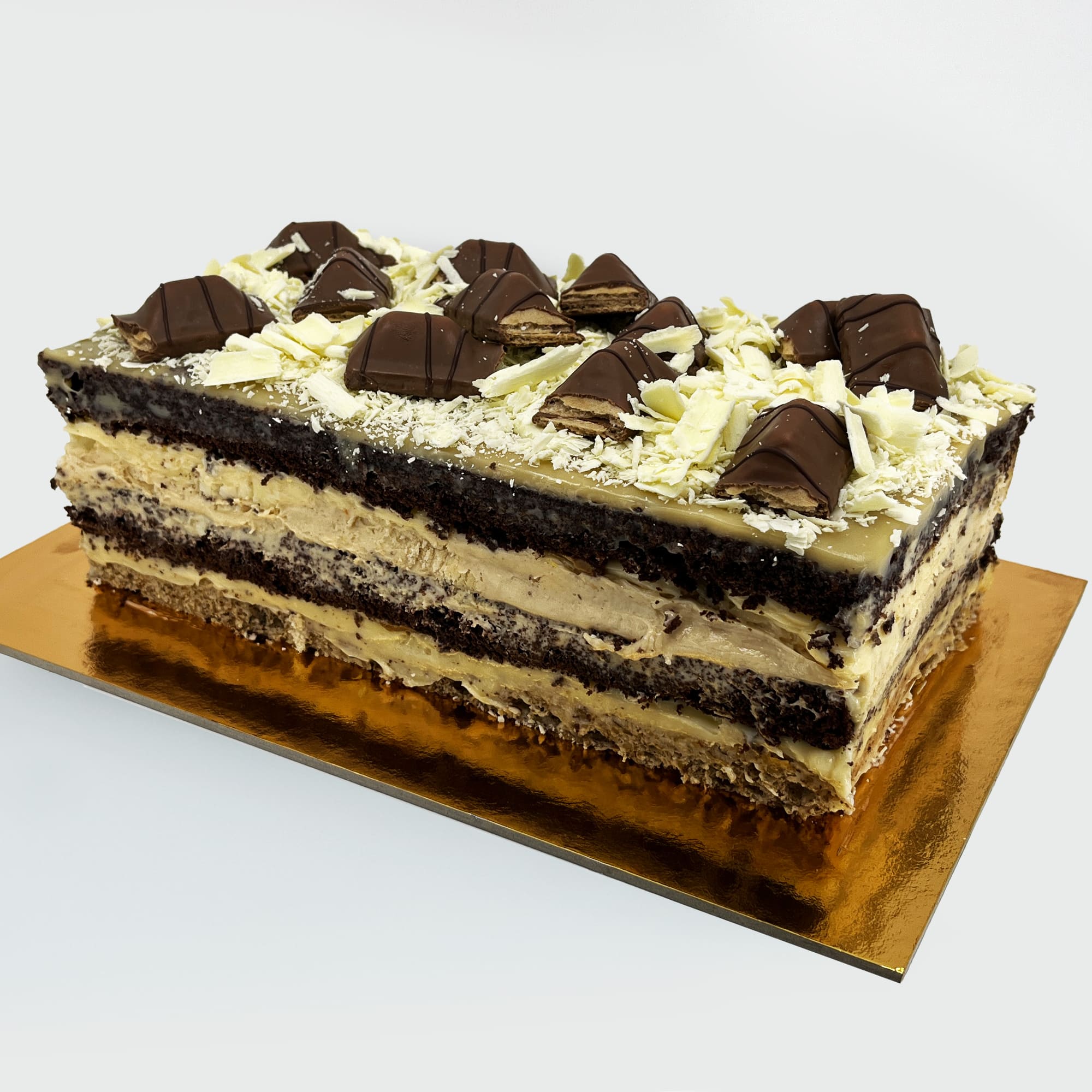 Tort cu blat pufos, cremă fină de ciocolată și alune, acoperit cu strat crocant de ciocolată, pentru un gust bogat și echilibrat.